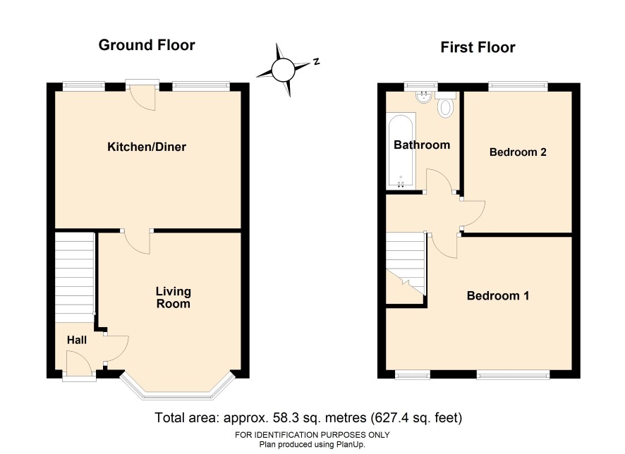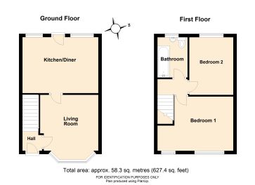 GROUND FLOOR Hall: Lounge: 12 ft 11 in max x 11 ft 3 in max Kitchen/Diner: 14 ft 2 in x 10 ft 11 in FIRST FLOOR Bedroom 1: 14 ft 3 in x 10 ft 6 in Bedroom 2: 11 ft x 8 ft 4 in max Bathroom: