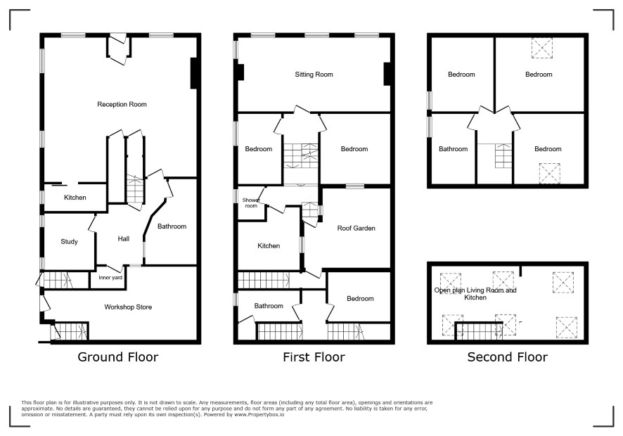Ground Floor Workshop/Store 12'3 x 12' First Floor Bathroom 11'9 x 5'6 Bedroom 11'3 x 10'3 Second Floor Sitting Room with Kitchen 27'6 x 14'6