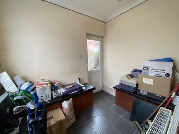 Open plan area with display windows, private staff area/storage, kitchen and outside toilet