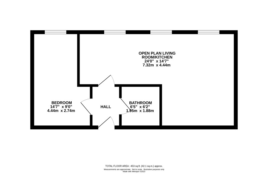Hall, bedroom, open plan living room/kitchen and bathroom