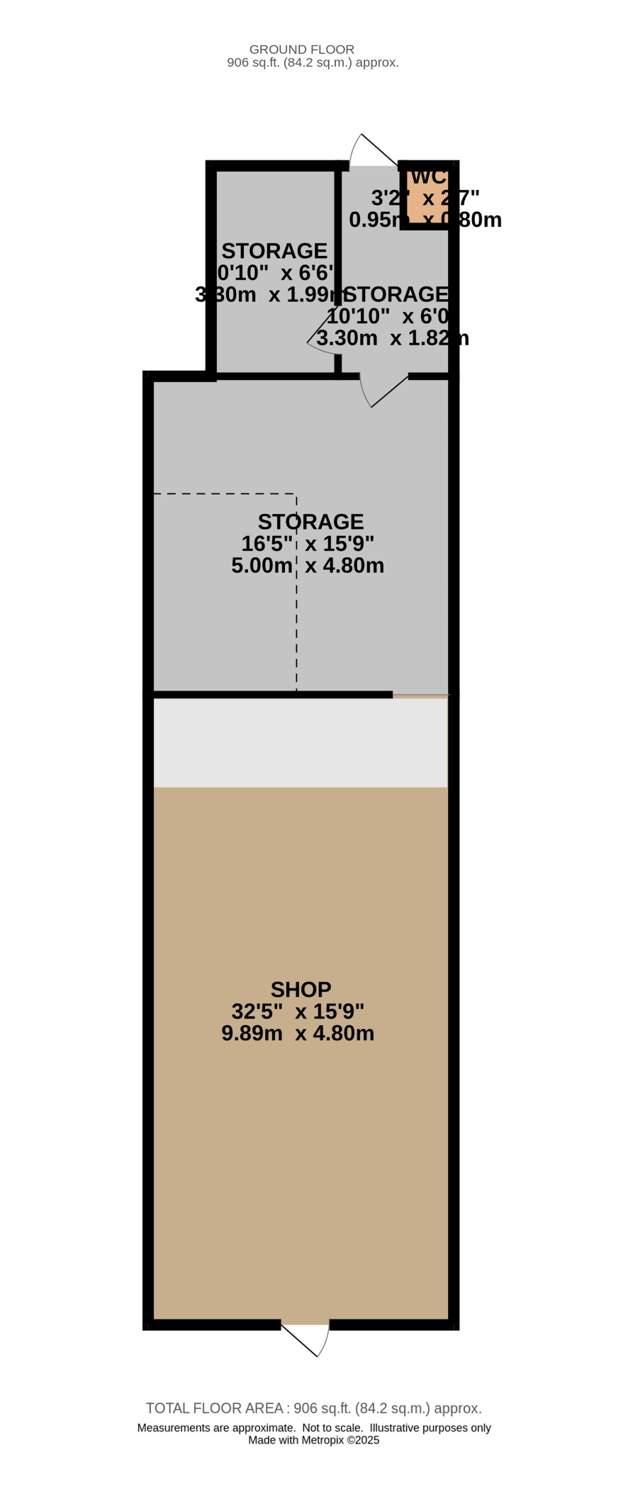 Internal Width: 15'9" Shop Depth: 32'5" Total Retail Area: 511 sq ft Storage Area: 16'5 x 15'9" Rear Storage: 10'10" x 6'6" Total Storage Area: 329 sq ft Rear Lobby incl. WC: 66 sq ft Total overall floor area: 906 sq.ft.