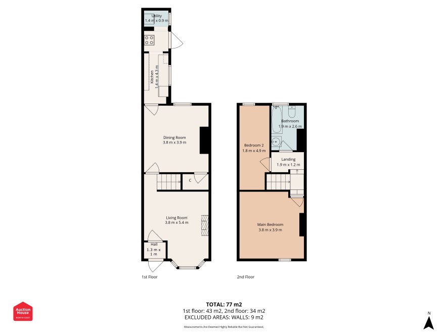 An excellent opportunity to acquire a well-presented two bedroom mid-terraced property situated within a popular residential area of Darlington. The property is currently let at £500 per calendar month, making it an attractive income-producing investment for landlords. The accommodation is arranged over two floors and briefly comprises an entrance hall leading into a spacious living room with bay window, followed by a separate dining room providing additional reception space. To the rear is a galley-style kitchen with access through to a utility area and the rear yard/garden. To the first floor there are two bedrooms, including a generous main bedroom, together with a family bathroom fitted with bath, wash basin and WC. Externally, the property benefits from a small forecourt to the front and an enclosed rear garden, providing useful outdoor space. The property extends to approximately 77 sq m (829 sq ft) and is conveniently located for local shops, schools and transport links, with Darlington town centre easily accessible. This property will appeal to buy-to-let investors seeking an immediate rental income with potential for future growth. Accommodation Ground Floor •{tab}Hallway •{tab}Living Room – 3.8m x 5.4m •{tab}Dining Room – 3.8m x 3.9m •{tab}Kitchen – 1.4m x 4.3m •{tab}Utility – 1.4m x 0.9m First Floor •{tab}Landing •{tab}Bedroom 1 – 3.8m x 3.9m •{tab}Bedroom 2 – 1.8m x 4.9m •{tab}Bathroom – 1.9m x 2.6m Tenancy The property is currently let at £500 per calendar month (£6,000 per annum). Tenure Freehold (assumed – buyers should verify). Auctioneers Note Buyers are advised to inspect the legal pack for full tenancy details.