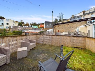 Two bedroom maisonette property located in Torquay, Devon. The accommodation is set over two floors with one bedroom on the ground floor alongside a kitchen and bathroom. The first floor comprises a single bedroom along with the living room which provides access to a private roof terrace.