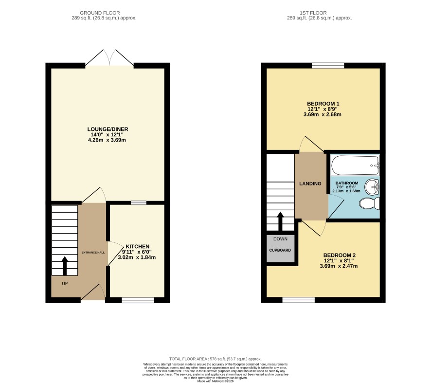 GROUND FLOOR Sitting Room - 14'00 x 12'01 Kitchen - 9'11 x 6'00 FIRST FLOOR Bedroom One - 8'09 x 12'02 Bedroom Two - 8'00 x 12'02 Bathroom - 7'00 x 5'07