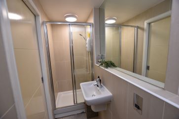 Kitchen area, bedroom and shower room.